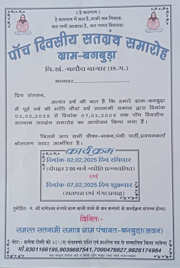 ग्राम पंचायत बगबुड़ा में सतनामी समाज द्वारा 2 फरवरी से 7 फरवरी तक पांच दिवसीय गुरु घासीदास बाबा जी की सतनाम सत ग्रंथ का आयोजन किया जा रहा है जिसमें 2 फरवरी को दोपहर 2 बजे से पूजा अर्चना एवं दीप प्रज्वलित कर सतनाम सतग्रंथ का शुभारंभ किया गया तथा 7 फरवरी को सतधारा एवं गंगा प्रवाह का कार्यक्रम होगा। जिसमें समस्त संत समाज, चौका भजन, मंगल भजन, पंथी पार्टी, सांस्कृतिक कार्यक्रम, टिककर श्रोतागण को सादर आमंत्रित किया गया है।