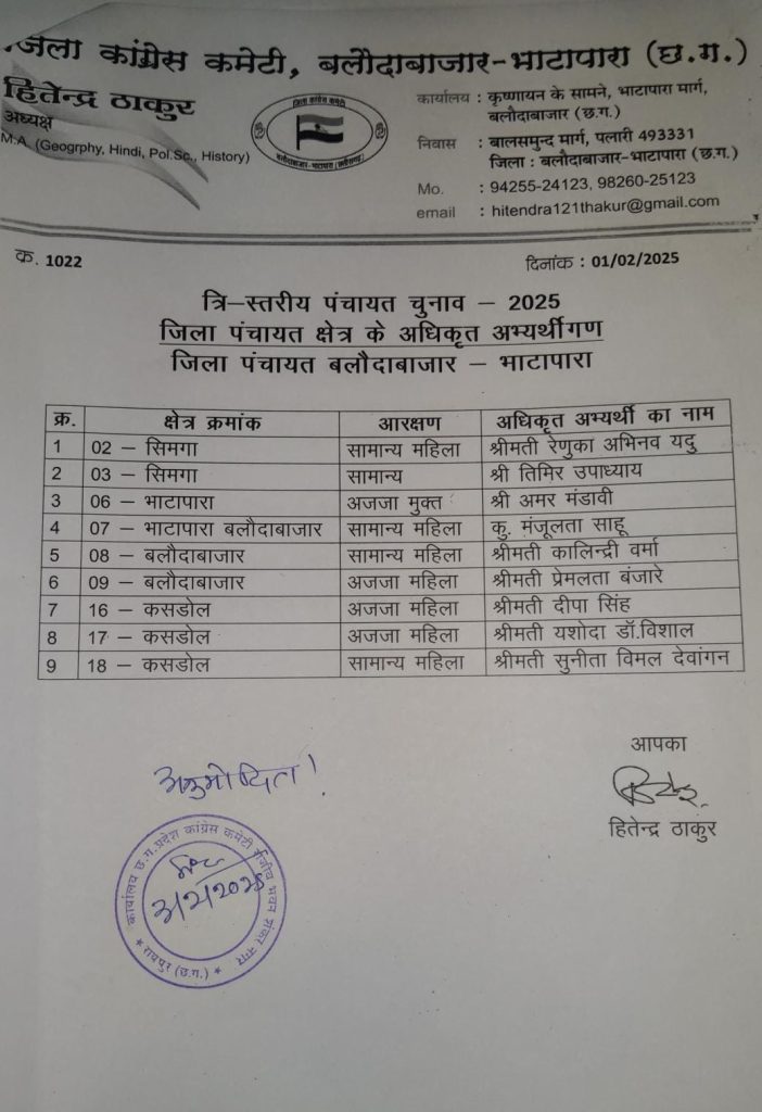 जिसमें जिला पंचायत क्षेत्र क्रमांक 2 सिमगा सामान्य महिला सीट से कांग्रेस की अधिकृत प्रत्याशी श्रीमती रेणुका अभिनव यदु इसी तरह जिला पंचायत क्षेत्र क्रमांक 3 सिमगा सामान्य सीट से तिमिर उपाध्याय, क्षेत्र क्रमांक 6 भाटापारा अजजा मुक्त अमर मंडावी, क्षेत्र क्रमांक 7 भाटापारा बलौदाबाजार सामान्य महिला कु. मंजुलता साहू, क्षेत्र क्रमांक 8 बलौदाबाजार सामान्य महिला श्रीमती कालीन्द्री वर्मा, क्षेत्र क्रमांक 9 बलौदाबाजार अजजा महिला प्रेमलता बंजारे, क्षेत्र क्रमांक 10 बलौदाबाजार सामान्य परमेश्वर यदु, क्षेत्र क्रमांक 11 बलौदाबाजार पलारी समान्य सुश्री पदमेश्वरी साहू, क्षेत्र क्रमांक 12 पलारी अपिव. अश्वनी वर्मा, क्षेत्र क्रमांक 13 पलारी अ जा सुनील कुमार भतपहरी, क्षेत्र क्रमांक 14 पलारी अ जा यशवंत बांधे, क्षेत्र क्रमांक 15 कसडोल अपिव श्रीमती गायत्री कैवर्त, क्षेत्र क्रमांक 16 कसडोल अजजा महिला श्रीमती दीपा सिंह, क्षेत्र क्रमांक 17 कसडोल अजजा महिला श्रीमती यशोदा डॉ विशाल, क्षेत्र क्रमांक 18 कसडोल सामान्य महिला श्रीमती सुनीता विमल देवांगन इन सभी को कांग्रेस पार्टी द्वारा स्त्री स्तरीय पंचायत चुनाव 2025 जिला पंचायत बलौदा बाजार भाटापारा क्षेत्र के अधिकृत अभ्यर्थी घोषित किया गया है।