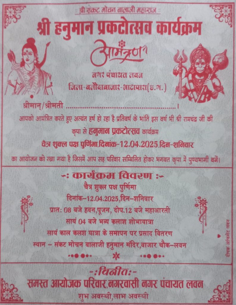 ( संवाददाता राक़ी साहू ) लवन श्री हनुमान जन्मोत्सव के पावन अवसर पर प्रति वर्ष की भाँति इस वर्ष भी भगवान प्रभु श्री रामचंद्र जी की कृपा से नगर पंचायत लवन में भव्य कलश शोभायात्रा निकाली जाएगी।