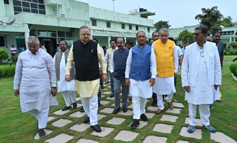 विधानसभा अध्यक्ष डॉ. रमन सिंह, मुख्यमंत्री विष्णु देव साय, नेता प्रतिपक्ष डॉ. चरणदास महंत, उपमुख्यमंत्री अरुण साव कार्यमंत्रणा समिति की बैठक में जाते हुए
