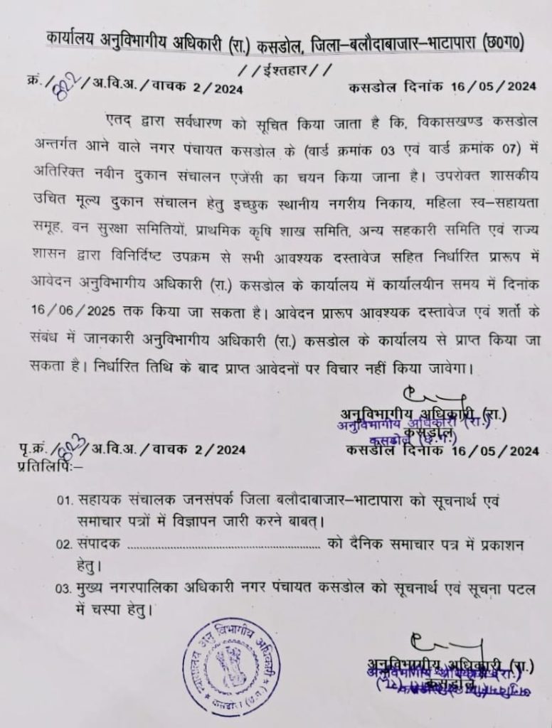 शासकीय उचित मूल्य दुकान संचालन हेतु इच्छुक स्थानिय नगरीय निकाय, महिला स्व सहायता समूह, प्राथमिक कृषि साख सहकारी समिति, अन्य समितियॉ एवं वन सुरक्षा समिति अनुविभागीय अधिकारी (राजस्व) कसडोल में 16 जून 2025 तक कार्य दिवस में कार्यालयीन समय में निर्धारित प्रारूप में दस्तावेज आवेदन प्रस्तुत कर सकते है। निर्धारित समयावधि पश्चात् प्राप्त आवेदन अथवा अपूर्ण आवेदन एवं दस्तावेज रहित आवेदन पत्रों पर विचार नही किया जाएगा। इधर राशन दुकान खुलने की जानकारी के बाद वार्डवासियों ने पार्षद भानु प्रताप साहू और नीरज साहू को धन्यवाद देकर आभार जताया है।