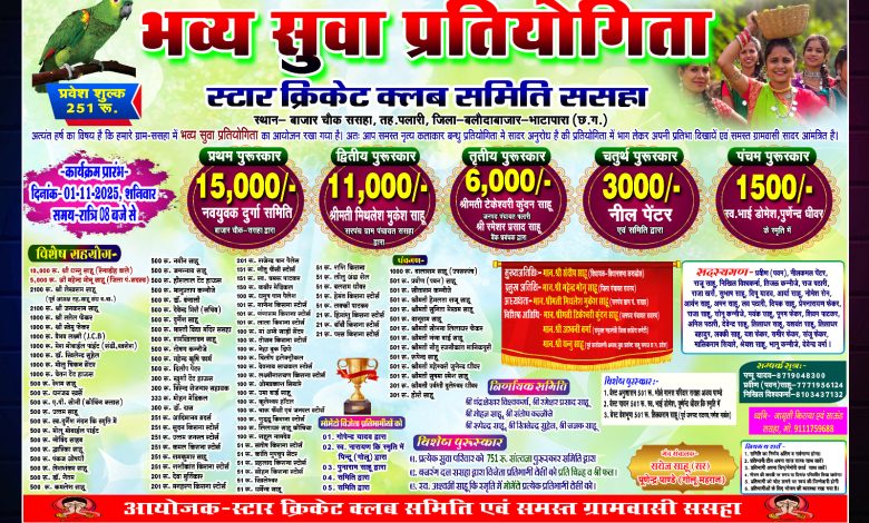 (गिधपुरी डोमार साहू)देवउठनी एकादशी के पावन अवसर पर ग्राम ससहा एवं देवसुन्दरा में संगीतमय सुवा प्रतियोगिता का आयोजन किया जा रहा है। यह आयोजन दिनांक 01 नवंबर शनिवार को सांस्कृतिक माहौल में संपन्न होगा।