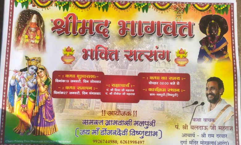 डोमार साहू ( गिधपुरी)ग्राम पंचायत मलपुरी में आगामी दिनों में धर्म, भक्ति और अध्यात्म का अद्भुत संगम देखने को मिलेगा। ग्राम स्थित डोगर देवी मंदिर परिसर में दिनांक 19 जनवरी से 27 जनवरी तक श्रीमद्भागवत कथा ज्ञान सप्ताह का भव्य आयोजन किया जा रहा है। यह आठ दिवसीय धार्मिक आयोजन पूरे क्षेत्र में आध्यात्मिक वातावरण का सृजन करेगा।