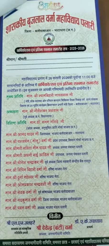 बलौदाबाजार – शासकीय बृजलाल वर्मा महाविद्यालय के वार्षिक उत्सव कार्यक्रम में उस समय सियासी माहौल गरमा गया जब कांग्रेस विधायक संदीप साहू बिना औपचारिक निमंत्रण के कार्यक्रम में पहुँच गए। अतिथि सूची में नाम नहीं होने पर विधायक ने इसे क्षेत्र की जनता का अपमान बताया।