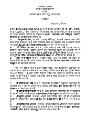 प्रशासन विभाग द्वारा जारी आदेश के अनुसार, डॉ. सीआर प्रसन्ना (2006 बैच), सचिव सहकारिता विभाग को उनके वर्तमान दायित्वों के साथ आयुक्त सहकारिता एवं रजिस्ट्रार, सहकारी समितियां का अतिरिक्त प्रभार सौंपा गया है। वहीं कुलदीप शर्मा (2014 बैच), रजिस्ट्रार सहकारी संस्थाएं को अस्थायी रूप से कलेक्टर, जिला बलौदाबाजार-भाटापारा पद पर पदस्थ किया गया