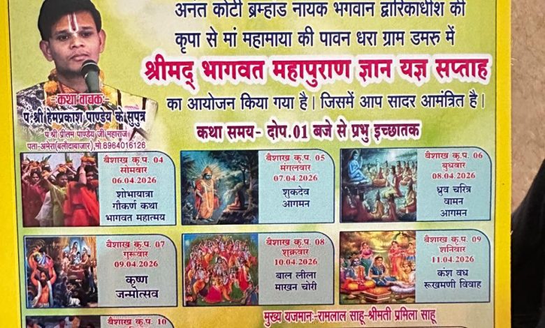 ( रॉकी साहू लवन ) ग्राम डमरू की पावन धरा पर माँ महामाया की असीम कृपा से श्रीमद् भागवत महापुराण ज्ञान यज्ञ सप्ताह का भव्य आयोजन होने जा रहा है आगामी 6 अप्रैल 2026 से 12 अप्रैल 2026 तक चलने वाले इस आध्यात्मिक महोत्सव में प्रसिद्ध कथा वाचक पं. श्री हेमप्रकाश पाण्डेय जी के (सुपुत्र पं. श्री प्रीतम पाण्डेय जी महाराज) अपनी अमृतमयी वाणी से भक्तों को रसपान कराएंगेआयोजन समिति द्वारा निर्धारित कार्यक्रम के अनुसार प्रतिदिन दोपहर 01 बजे से प्रभु इच्छा तक कथा का प्रवाह चलेगा सात दिनों तक चलने वाले इस यज्ञ में विभिन्न धार्मिक प्रसंगों का सजीव वर्णन किया जाएगा जिसमे