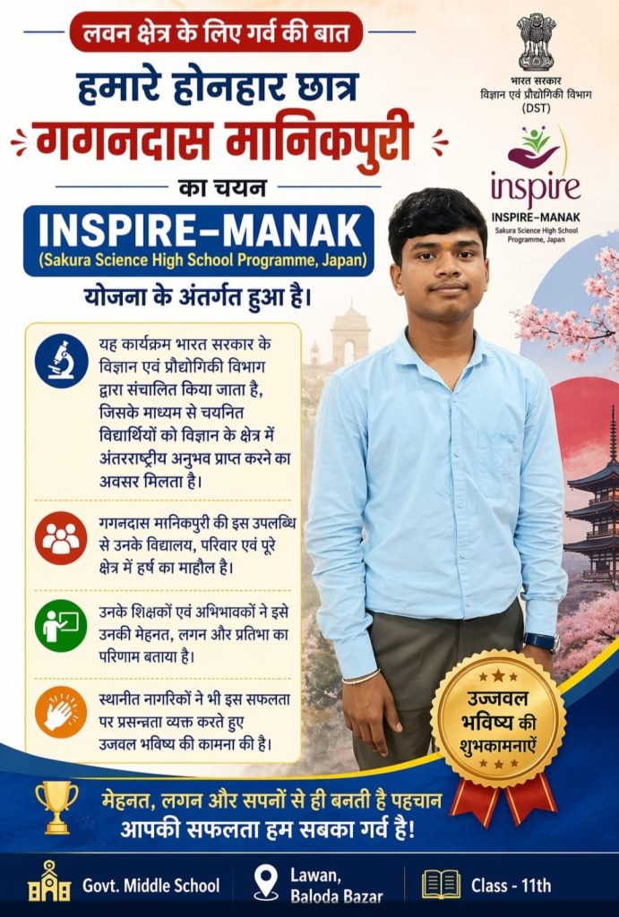 लवन, विज्ञान के क्षेत्र में अपनी मेधा का लोहा मनवाते हुए लवन क्षेत्र के होनहार छात्र गगनदास मानिकपुरी ने एक बड़ी उपलब्धि हासिल की है गगनदास का चयन भारत सरकार की अत्यंत प्रतिष्ठित इंस्पायर मानक योजना के अंतर्गत सकुरा साइंस हाई स्कूल प्रोग्राम जापान के लिए हुआ है इस खबर के बाद से ही पूरे बलौदाबाजार जिले सहित लवन क्षेत्र में हर्ष और गर्व का माहौल है