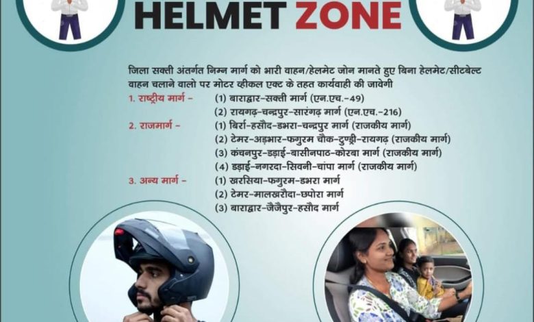 सक्ती जिले के नेशनल हाइवे बाराद्वार-सक्ती, रायगढ़-चंद्रपुर-सारंगढ़ मार्ग, राजमार्ग बिर्रा-हसौद-डभरा-चंद्रपुर मार्ग, टेमर, अड़भार, फगुरम चौक, टुंड्री-रायगढ़, कंचनपुर, डड़ाई, बासीनपाठ, कोरबा मार्ग, डड़ाई-नगरदा-सिवनी, चांपा मार्ग सहित खरसिया, टेमर-मालखरौदा-छपोरा, बाराद्वार-जैजैपुर, हसौद मार्ग में बिना हेलमेट, सीटबेल्ट वाहन चलाने वालों पर मोटर वीकल एक्ट के तहत कार्रवाई की जाएगी। इस मार्ग में पुलिस के जवान तैनात रहेंगे। जांजगीर जिले में भी नेशनल हाइवे में बिना हेलमेट पहने वाहन चालकों से जुर्माना वसूल किया जाएगा। पहले दिन समझाइश दी जाएगी। फिर कार्रवाई तेज करेंगे।