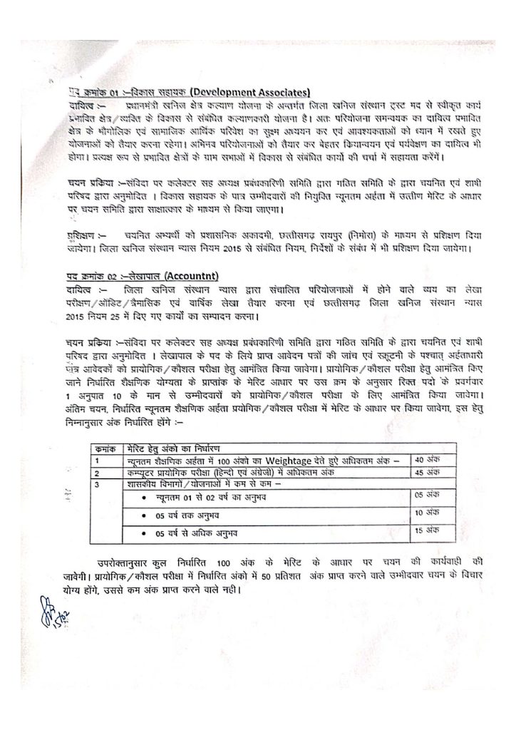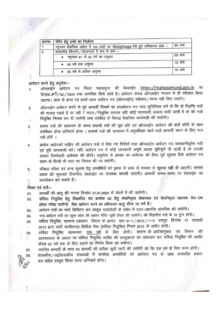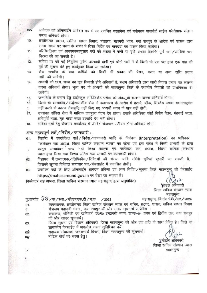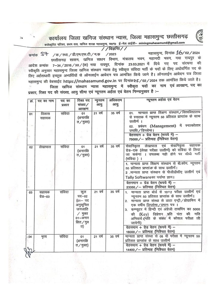 महासमुन्द – छग जिला खनिज संस्थान न्यास एवं सचिव, छ.ग. शासन खनिज साधन विभाग के पत्र में दिए गये पद स्वीकृत अनुसार जिला खनिज संस्थान न्यास अंतर्गत जिला कार्यालय महासमुंद में संविदा भर्ती के अधोवर्णित पद के लिए योग्य उम्मीदवार से आवेदन पत्र आमंत्रित किया जाता है। आवेदन पत्र कार्यालय कलेक्टर, जिला खनिज संस्थान न्यास महासमुंद , जिला – महासमुंद (छ.ग.) अंतिम तिथि 25.02.2024 सायं 5.00 बजे तक ऑनलाइन आवेदन हो जाना चाहिए |