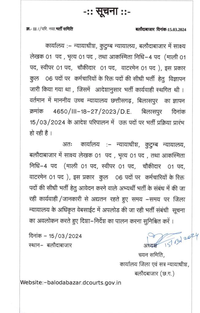 बलौदाबाजार – जिला सत्र न्यायालय माली स्वीपर वाटर मैन चौकीदार जैसे पदों के लिए भर्ती चालू है