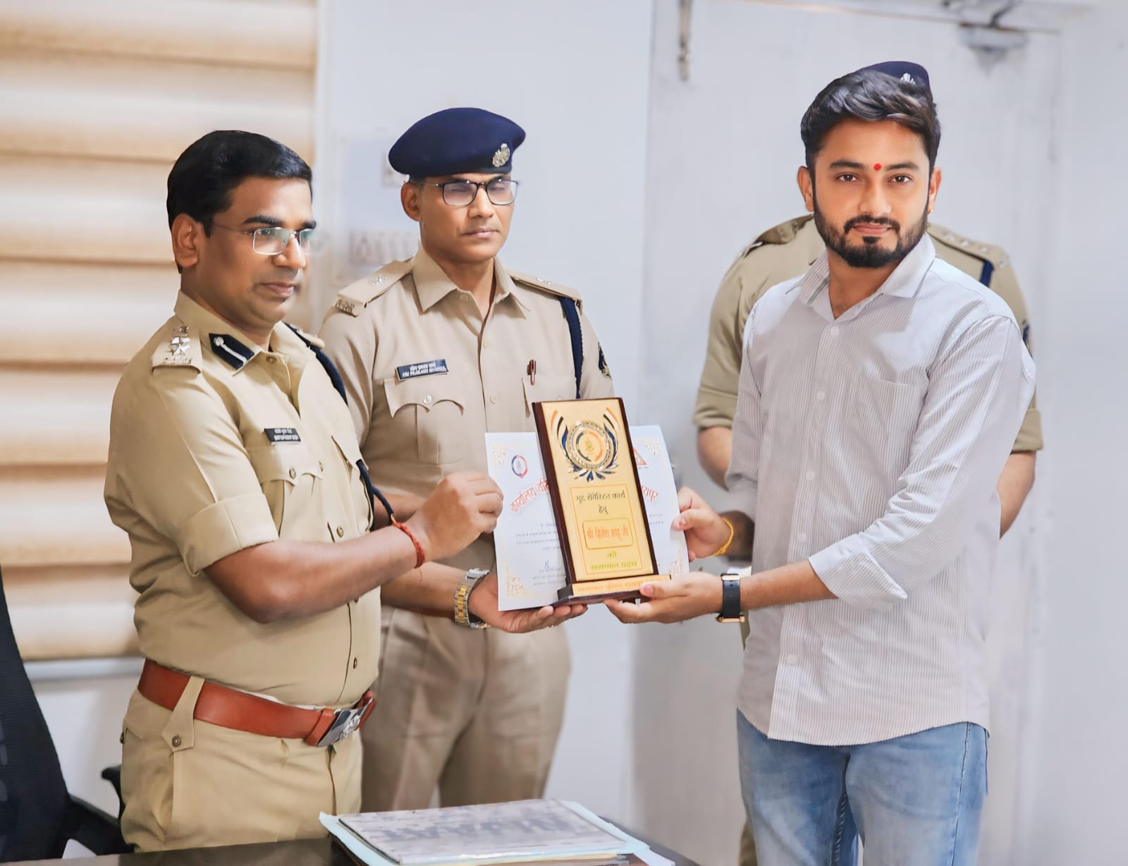 सड़क दुर्घटना में घायलों की मदद करने हेतु रायपुर पुलिस ने हितेश साहू को किया सम्मानित
