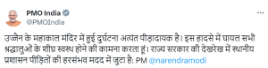 प्रधानमंत्री कार्यालय ने एक्स पर एक पोस्ट किया। पीएम मोदी ने कहा कि उज्जैन के महाकाल मंदिर में हुई दुर्घटना को अत्यंत पीड़ादायक है। इस हादसे में घायल सभी श्रद्धालुओं के शीघ्र स्वस्थ होने की कामना करता हूं। राज्य सरकार की देखरेख में स्थानीय प्रशासन पीड़ितों की हरसंभव मदद में जुटा है।