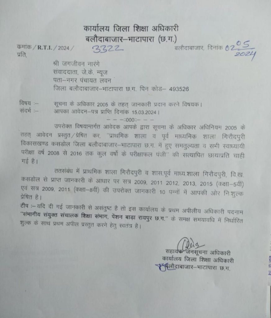 जिसमें सत्र 2008 में 24 परीक्षार्थी परीक्षा में बैठे थे एक अनुपस्थित कुल 25 परीक्षार्थी सम्मलित हुए थे । परंतु सूचना के अधिकार के तहत महिला बाल विकास विभाग कसडोल में ग्राम पंचायत बरेली में आंगनबाड़ी सहायिका की भर्ती में संध्या पिता घासीराम वर्ष 2008 अंकसूची शासकीय प्राथमिक शाला गिरौदपुरी से प्रधान पाठक के द्वारा दिया गया जानकारी में जिसमें अंकसूचि के सरल क्रमांक 27 व में 92% है । जबकि पूर्व में दिए गए परीक्षा फल पंजी में नाम ही नहीं है । इसी तरह सरल क्रमांक 25 में कल्याणी पिता गोवर्धन अहिवार की 96% व क्रमांक 26 में विनोद कुमार पिता लहुर सिंह घासी का 98% फर्जी जोड़ा गया है इसी तरह वर्ष 2008 में रूपेश पिता शंकर लाल का 99.83 प्रतिशत पांचवी व आठवीं में 2011 स्वधाई के में रूपेश कुमार पिता शंकर लाल 99. 95 प्रतिशत फर्जी अंक सूची बनाकर वर्तमान में वाहन चालक के पद पर कार्यलय कलेक्टर महासमुंद में कार्यरत है इसका खुलासा तब हुआ जब सूचना के अधिकार के तहत जानकारी मांगी जिला शिक्षा अधिकारी बलौदाबाजार गिरौदपुरी के प्रधान पाठक गिरौदपुरी के द्वारा दिए गए परीक्षाफल पंजी में इन सभी का कोई नाम नहीं था जानकारी के अनुसार इसका मुख्य सरगना के द्वारा और कई विभागों में गिरौदपुरी स्कूल के नाम से फर्जी अंक सूची बनाकर फार्म भरा गया है