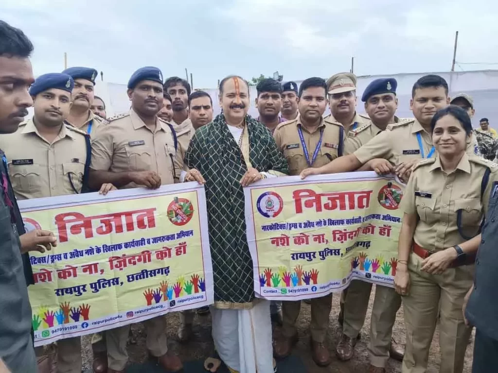 रायपुर -रायपुर ग्राम गनौद नया रायपुर में हो रहे शिव महापुराण के दौरान आज अंतरराष्ट्रीय कथा वाचक पंडित प्रदीप मिश्रा ने रायपुर पुलिस द्वारा नशा के विरुद्ध चलाये जा रहे “निजात” अभियान की सराहना करते हुए वरिष्ठ पुलिस अधीक्षक रायपुर संतोष सिंह एवं रायपुर पुलिस टीम को इसके लिए बधाई दी। और लोगो को नशा को त्यागने और रायपुर पुलिस टीम की निजात अभियान से अधिक से अधिक जुड़कर इसको प्रभावी बनाने की लिए संबोधित किया।