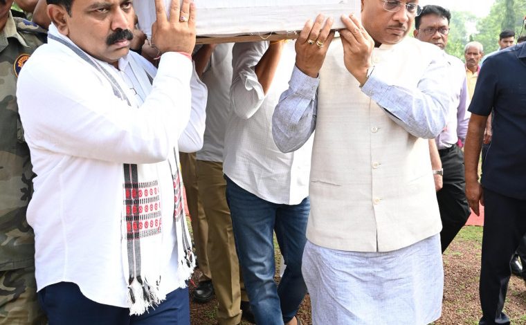 मुख्यमंत्री विष्णु देव साय और उप मुख्यमंत्री विजय शर्मा ने शहीद जवान के पार्थिव शरीर को कांधा दिया