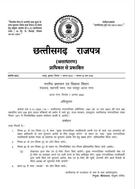 रायपुर – छत्तीसगढ़ सरकार ने नगरीय निकायों में आने वाले नगर पंचायत अध्यक्ष और नगर पालिका अध्यक्ष का वित्तीय अधिकार खत्म कर दिया है. अब यह अधिकार सीएमओ को प्रदान कर दिया है. राजपत्र में प्रकाशित हुए इस संशोधन के बाद नगर पालिका और नगर पालिका के चुने हुए अध्यक्ष के पास वित्तीय अधिकार नहीं रहेंगे. मिली जानकारी के अनुसार भुगतान किया गया नस्ती और भुगतान की जानकारी 3 दिन के भीतर अध्यक्ष को सूचनार्थ भेजा जाएगा. इस कदम को नगरीय निकाय में काबिज अध्यक्षों के लिए बड़ा झटका माना जा रहा है.