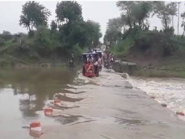बारिश से सड़कें लबालब, जान जोखिम में डाल पार कर रहे पुल