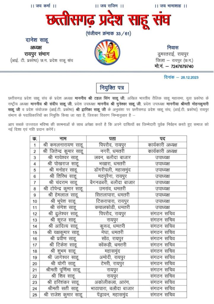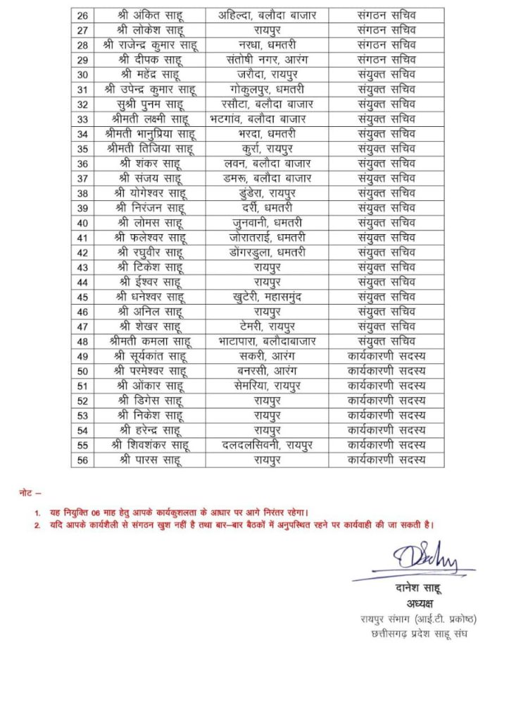 साहू संघ आई. टी.प्रकोष्ठ रायपुर संभाग अध्यक्ष दानेश साहू ने अपने कार्यकारणी का किया विस्तार 56 लोगों की हुई नियुक्ति