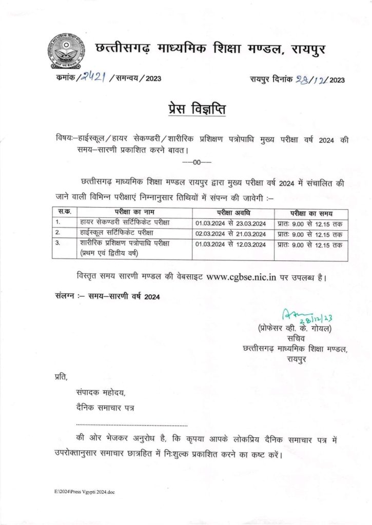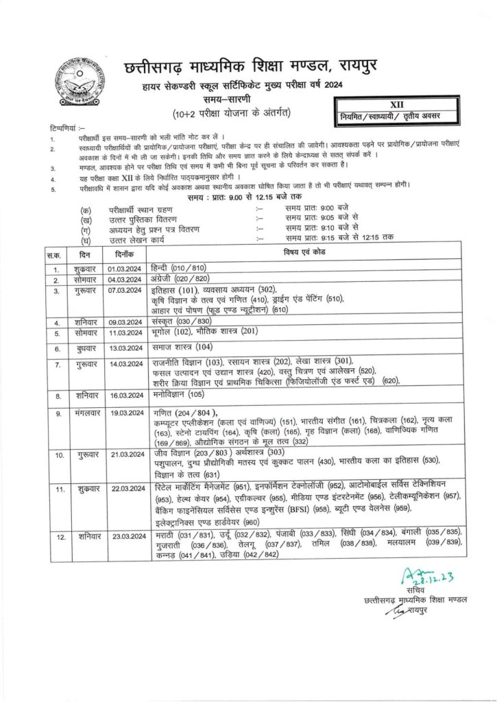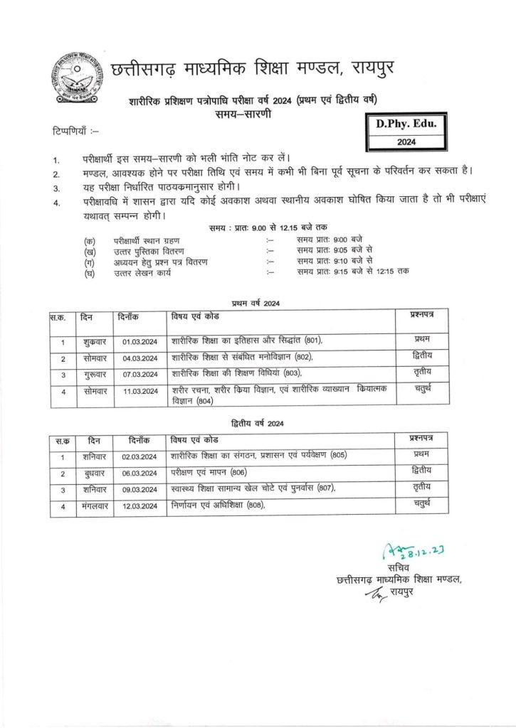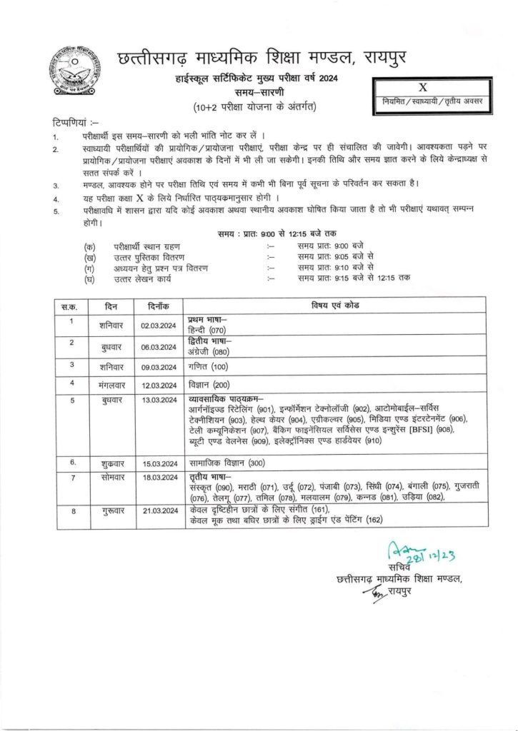 रायपुर -छत्तीसगढ़ माध्यमिक शिक्षा मंडल रायपुर ने दसवीं एवं बारहवीं के परीक्षा समय सारणी घोषित कर दिए ।